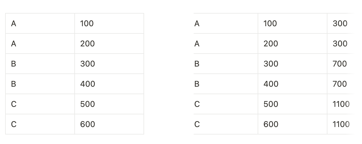 SELECT 그룹, 값, SUM(값) OVER (PARTITION BY 그룹) AS 합계 FROM 테이블
