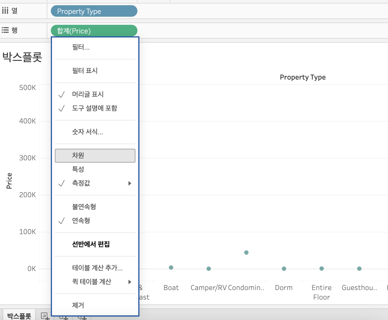 1. 행에 Price , 열에 Property Type 넣기 - Price 차원으로 속성 변경